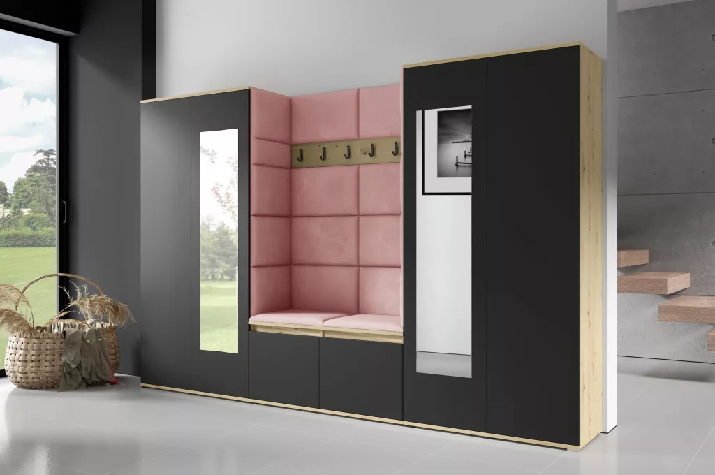Blum 10 kárpitozott előszobafal tükörrel, artisan/fekete - rózsaszín 23 - egyedi