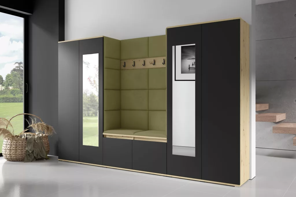 Blum 10 kárpitozott előszobafal tükörrel, artisan/fekete - oliva zöld 27 - egyedi