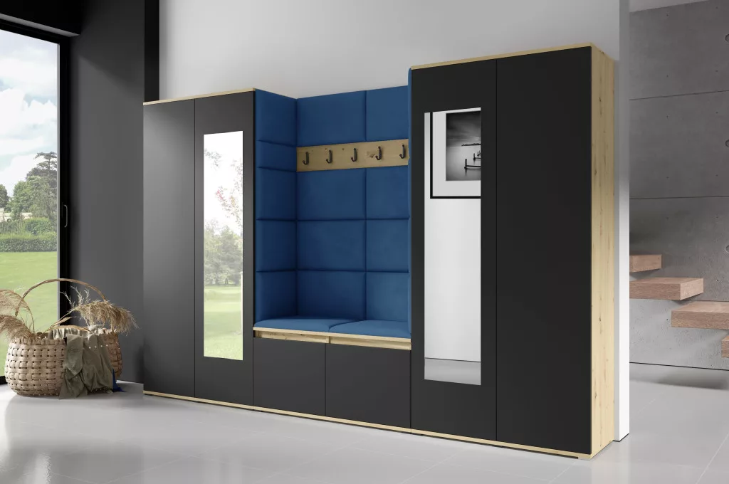 Blum 10 kárpitozott előszobafal tükörrel, artisan/fekete - sötétkék 31 - egyedi