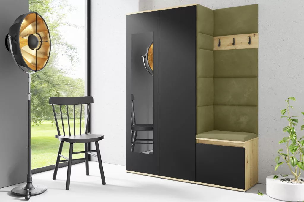 Blum 11 kárpitozott előszobafal tükörrel, artisan/fekete - oliva zöld 27 - egyedi