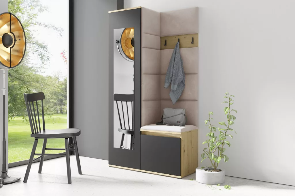 Blum 13 kárpitozott előszobafal tükörrel, artisan/fekete - bézs 02