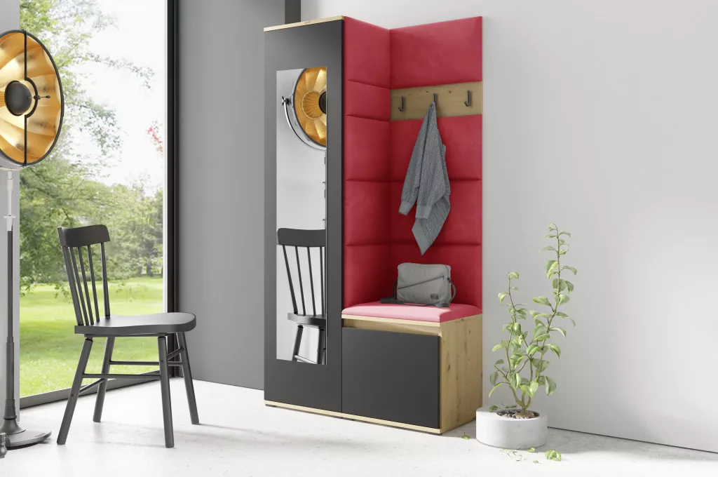 Blum 13 kárpitozott előszobafal tükörrel, artisan/fekete - piros 09 - egyedi