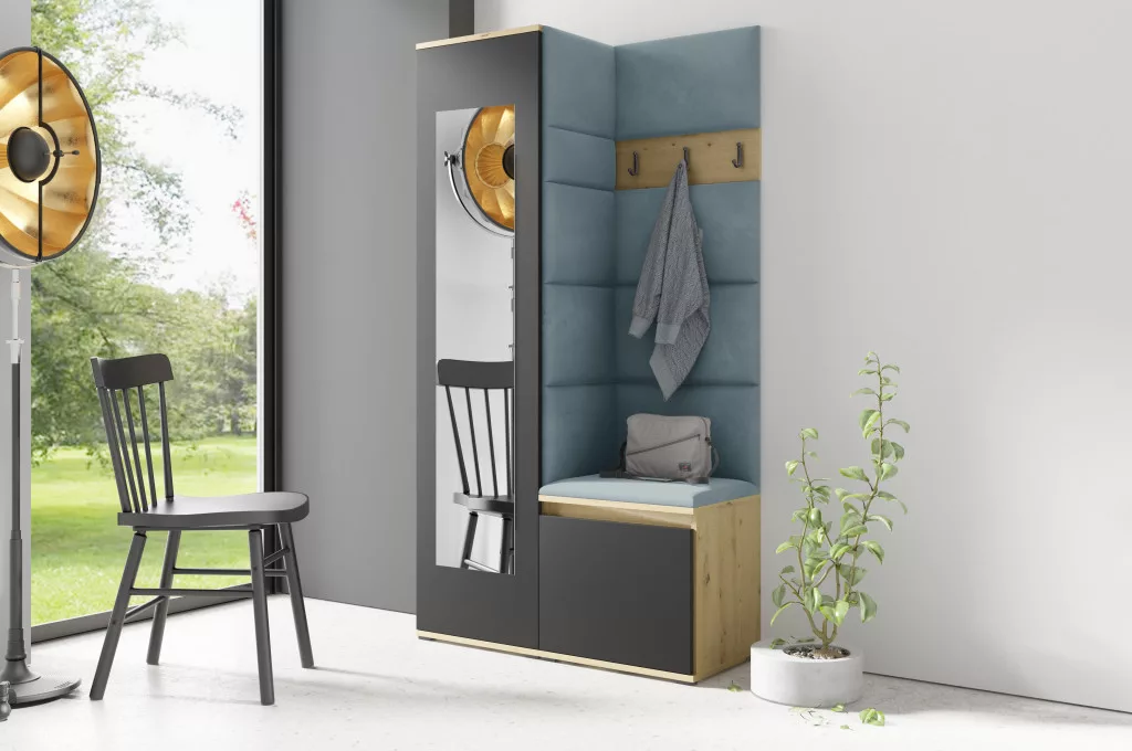 Blum 13 kárpitozott előszobafal tükörrel, artisan/fekete - aqua 22 - egyedi