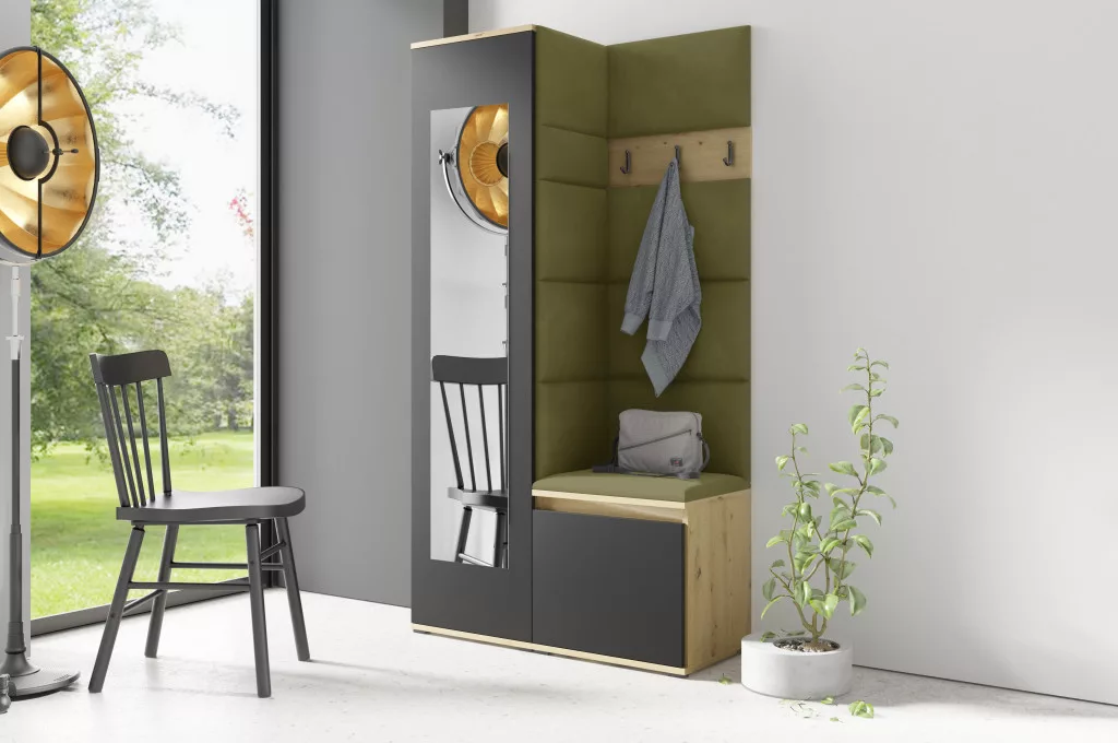 Blum 13 kárpitozott előszobafal tükörrel, artisan/fekete - oliva zöld 27 - egyedi