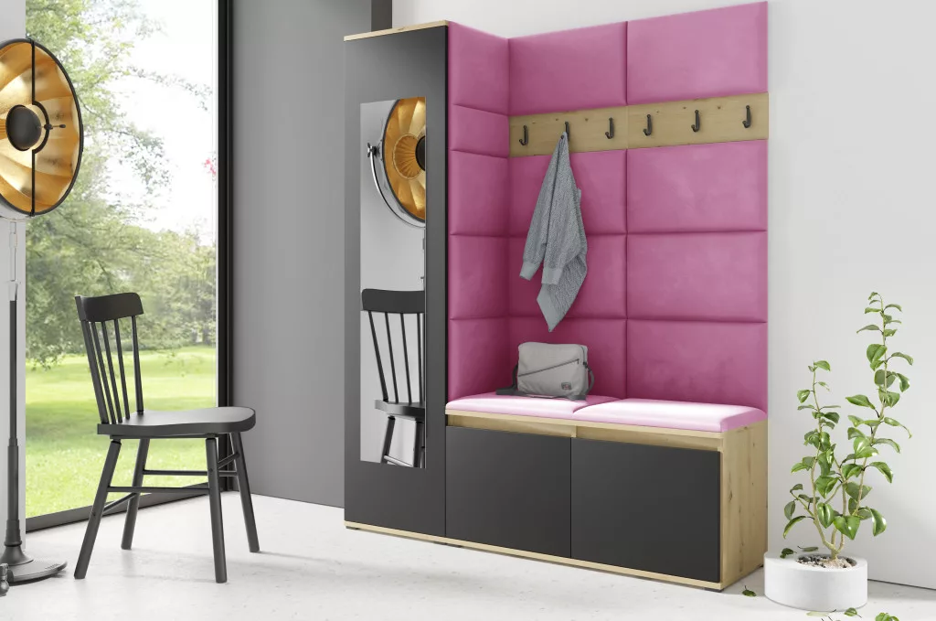 Blum 14 kárpitozott előszobafal tükörrel, artisan/fekete - pink 10 - egyedi