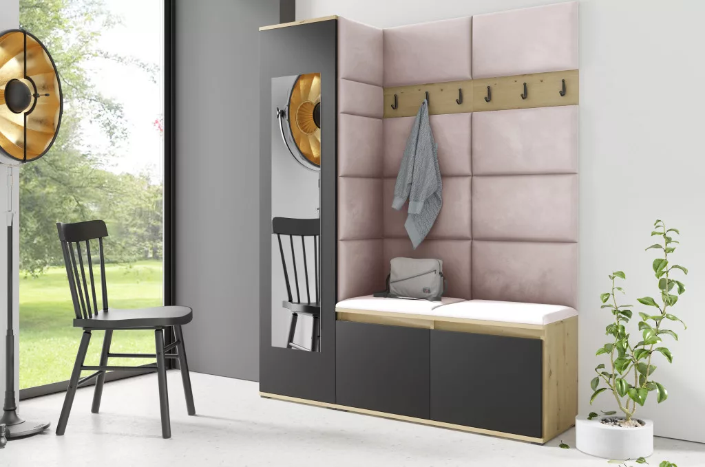 Blum 14 kárpitozott előszobafal tükörrel, artisan/fekete - rózsaszín 19 - egyedi