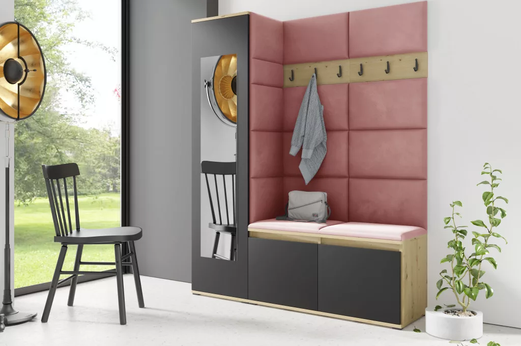 Blum 14 kárpitozott előszobafal tükörrel, artisan/fekete - rózsaszín 23 - egyedi