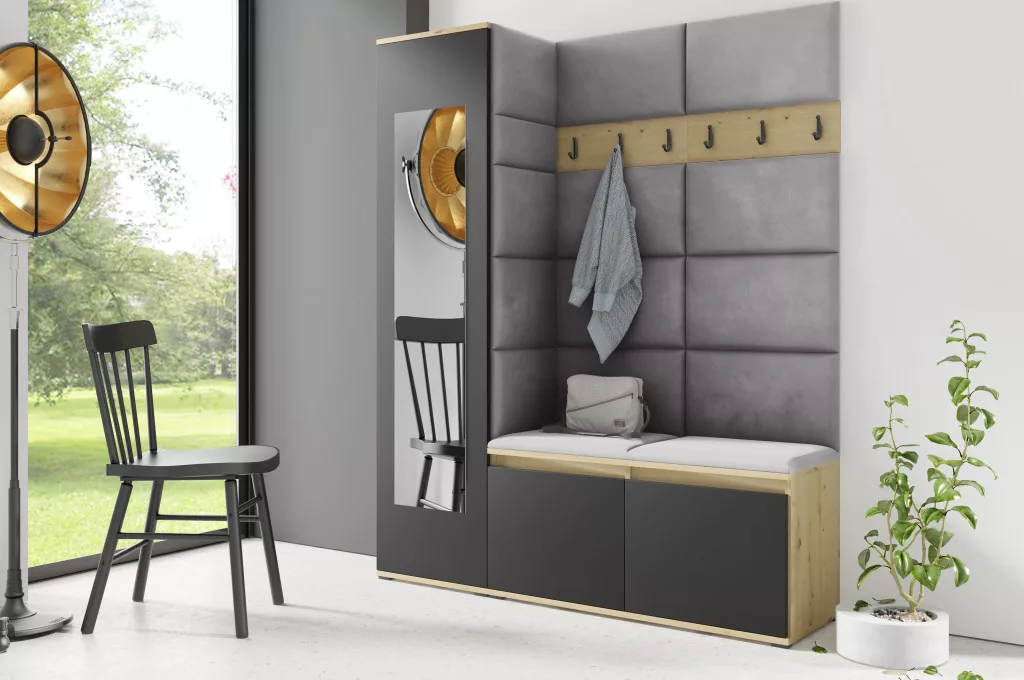 Blum 14 kárpitozott előszobafal tükörrel, artisan/fekete - ezüst 33 - egyedi