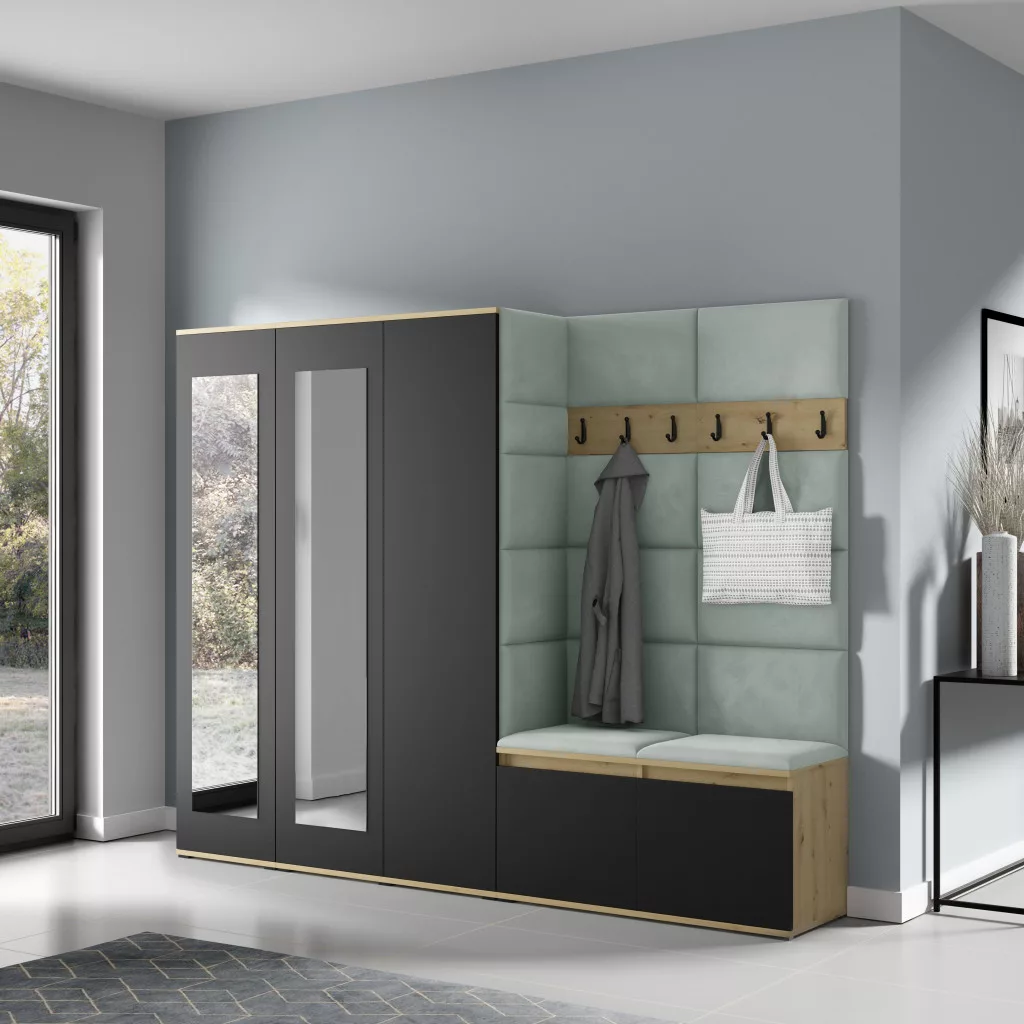 Blum 15 kárpitozott előszobafal tükörrel, artisan/fekete - menta 21 - egyedi