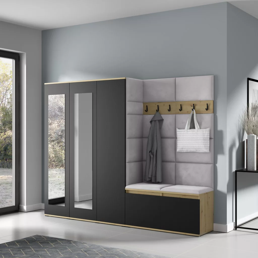 Blum 15 kárpitozott előszobafal tükörrel, artisan/fekete - ezüst 32 - egyedi