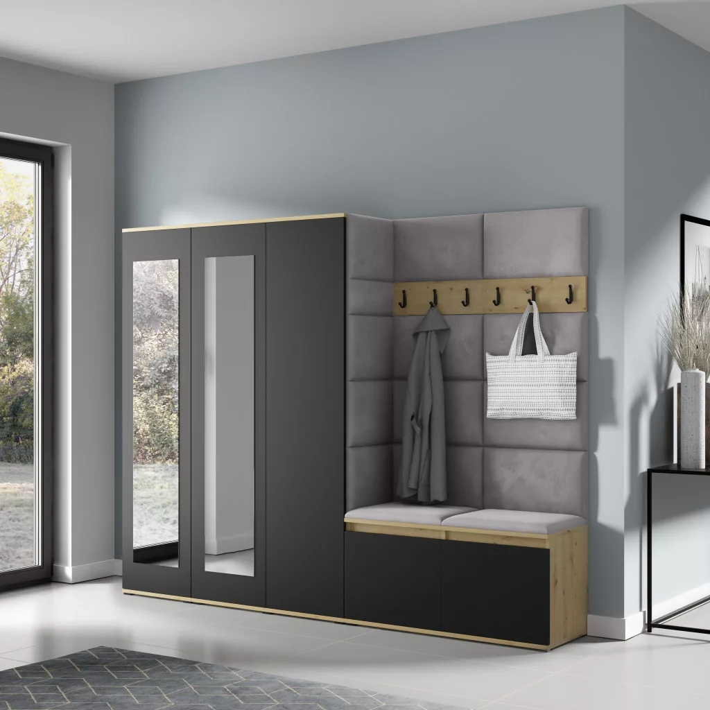 Blum 15 kárpitozott előszobafal tükörrel, artisan/fekete - ezüst 33 - egyedi