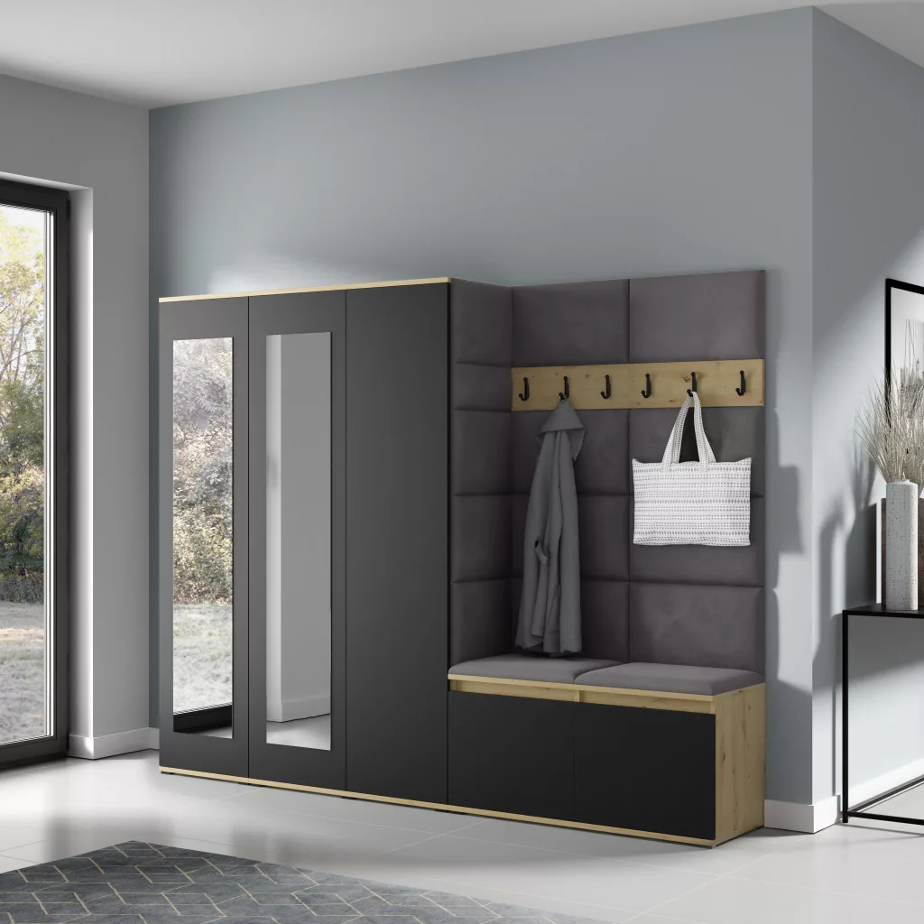 Blum 15 kárpitozott előszobafal tükörrel, artisan/fekete - szürke 34 - egyedi