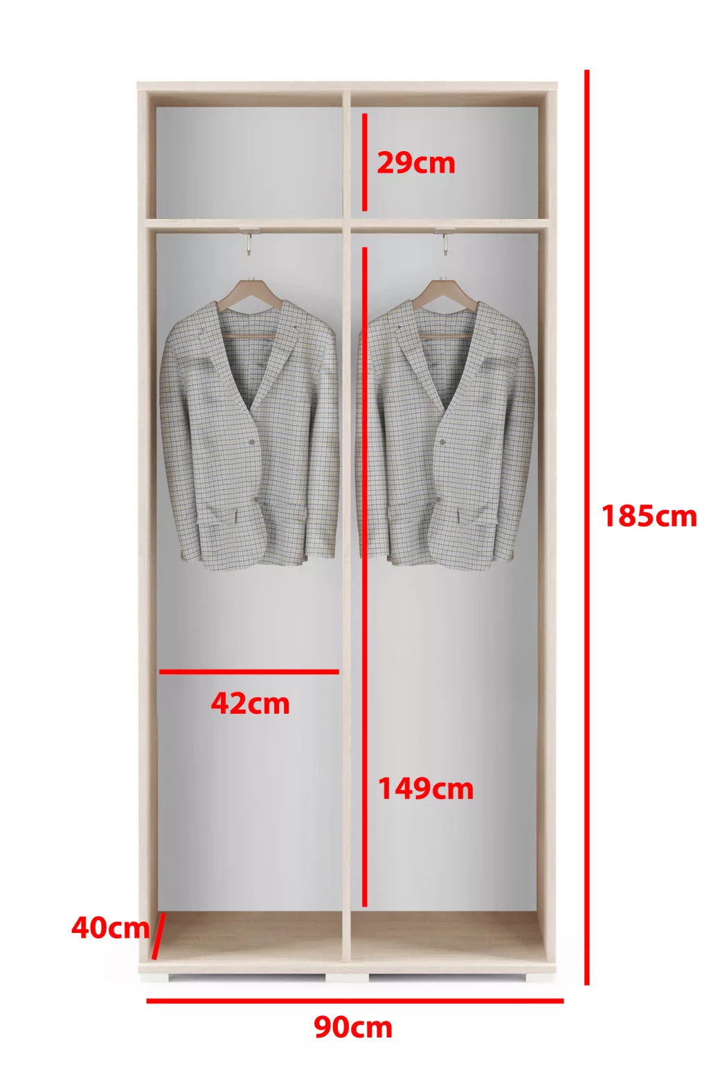 1 db 90 cm széles gardróbszekrény - 2 db polccal, 2 db akasztóval - ajtói push-to-open rendszerrel, benyomásra nyílnak