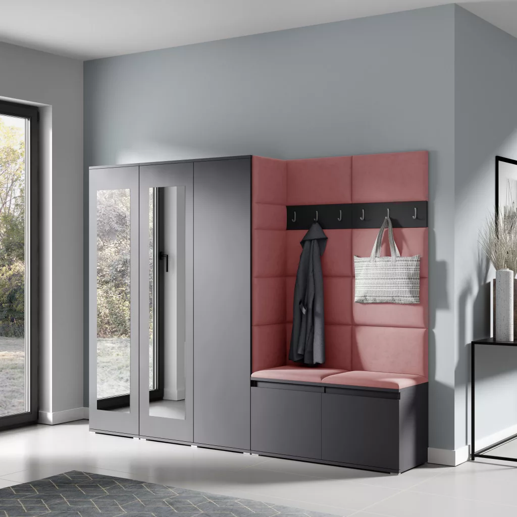 Blum 15 kárpitozott előszobafal tükörrel, grafit - rózsaszín 23 - egyedi
