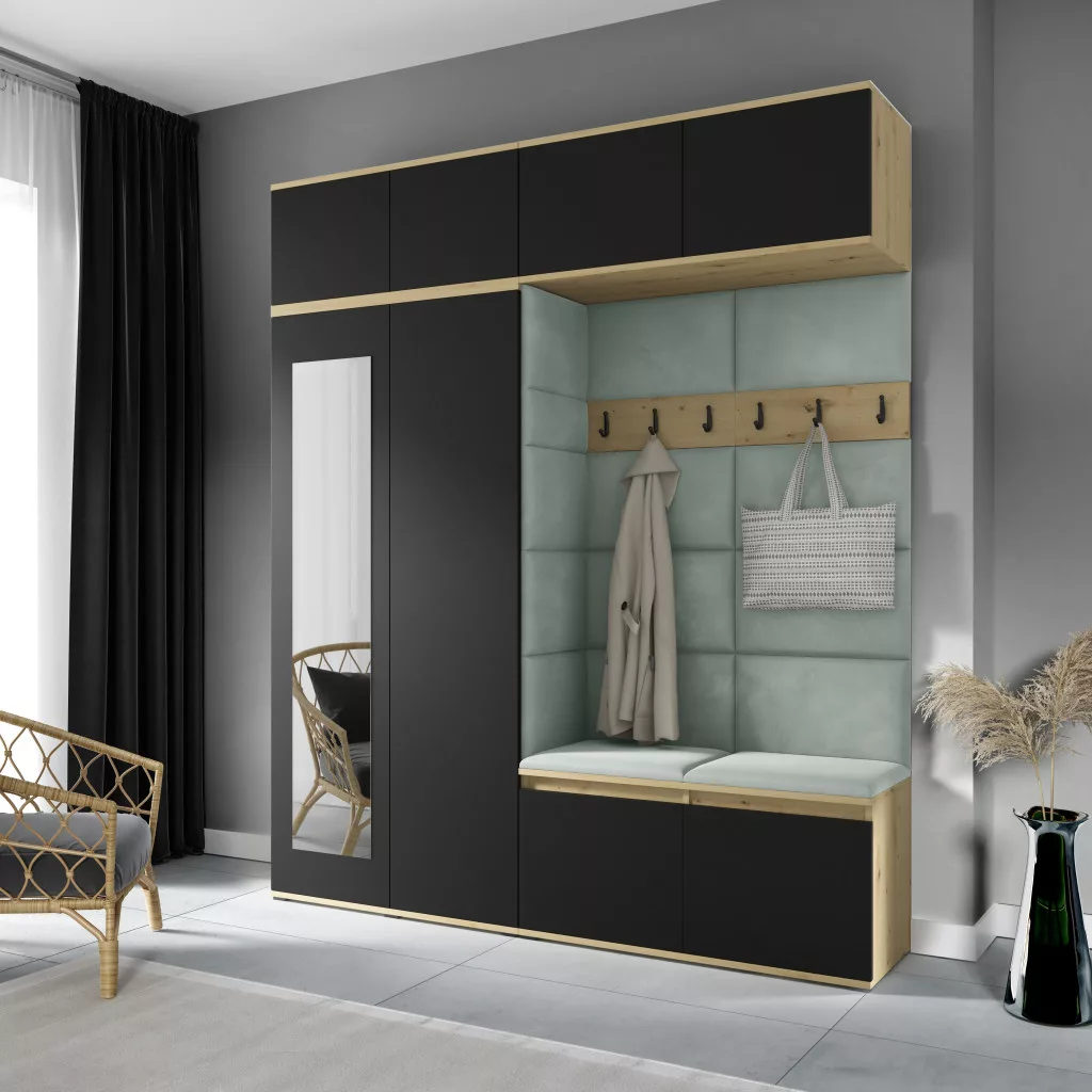 Blum 16 kárpitozott előszobafal tükörrel, artisan/fekete - menta 21 - egyedi