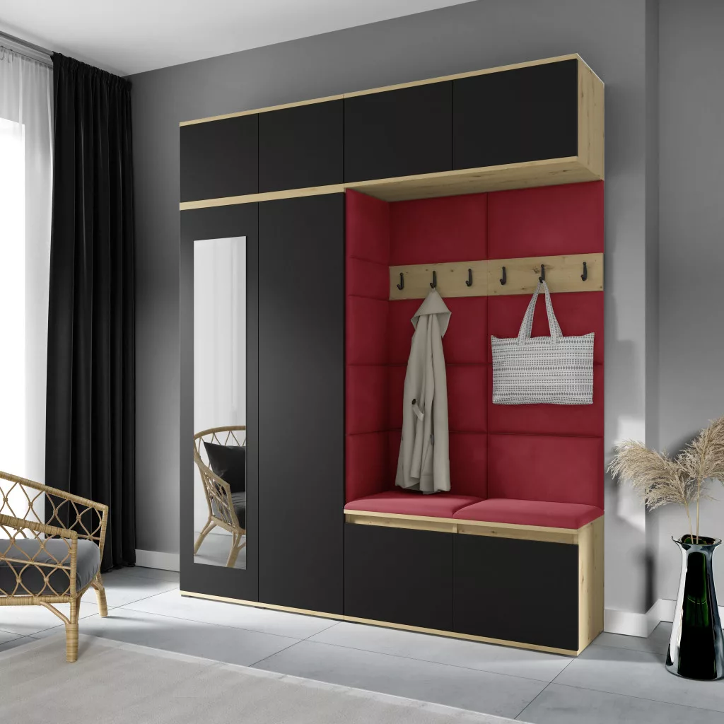 Blum 16 kárpitozott előszobafal tükörrel, artisan/fekete - rubinvörös 24 - egyedi