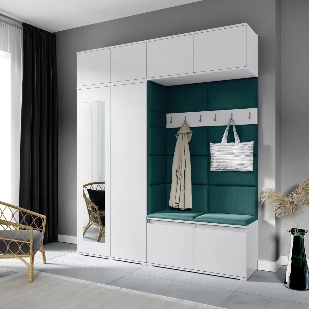 Blum 16 kárpitozott előszobafal tükörrel, fehér - sötétzöld 28 - egyedi