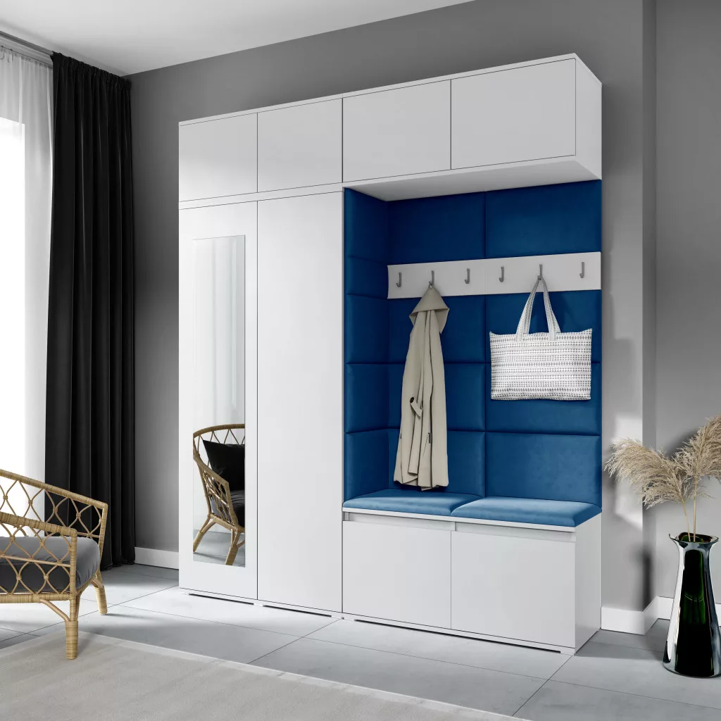 Blum 16 kárpitozott előszobafal tükörrel, fehér - sötétkék 31 - egyedi