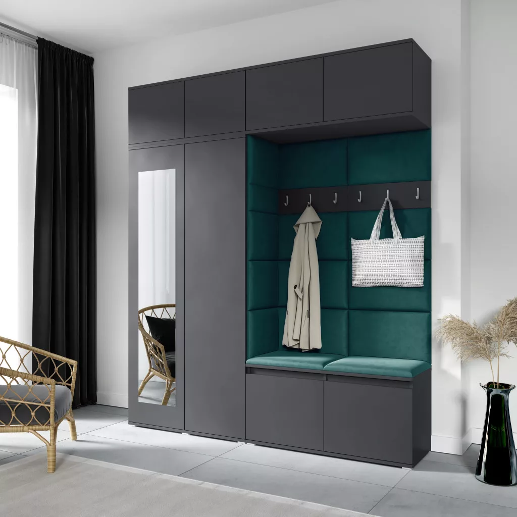 Blum 16 kárpitozott előszobafal tükörrel, grafit - sötétzöld 28 - egyedi
