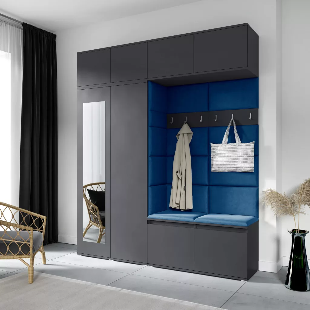 Blum 16 kárpitozott előszobafal tükörrel, grafit - sötétkék 31 - egyedi