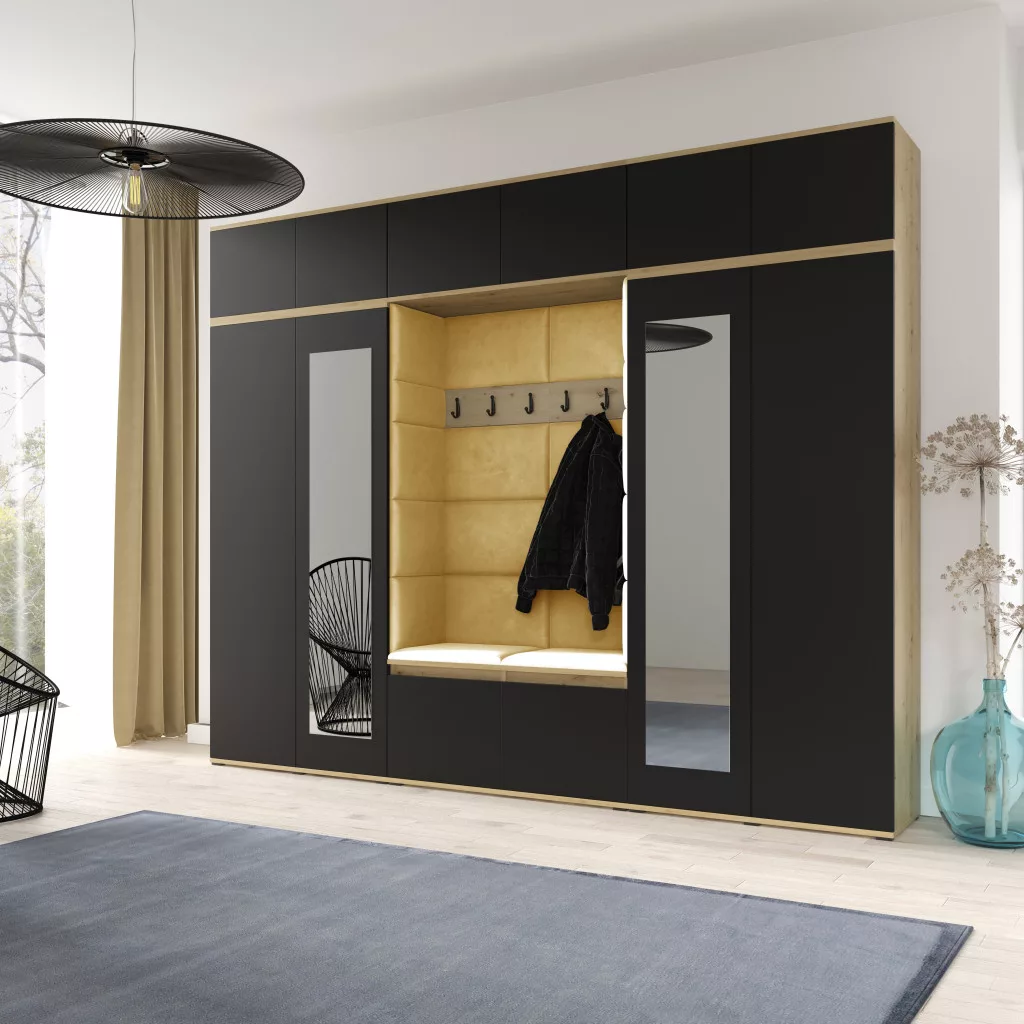 Blum 17 kárpitozott előszobafal tükörrel, artisan/fekete - sárga 18 - egyedi
