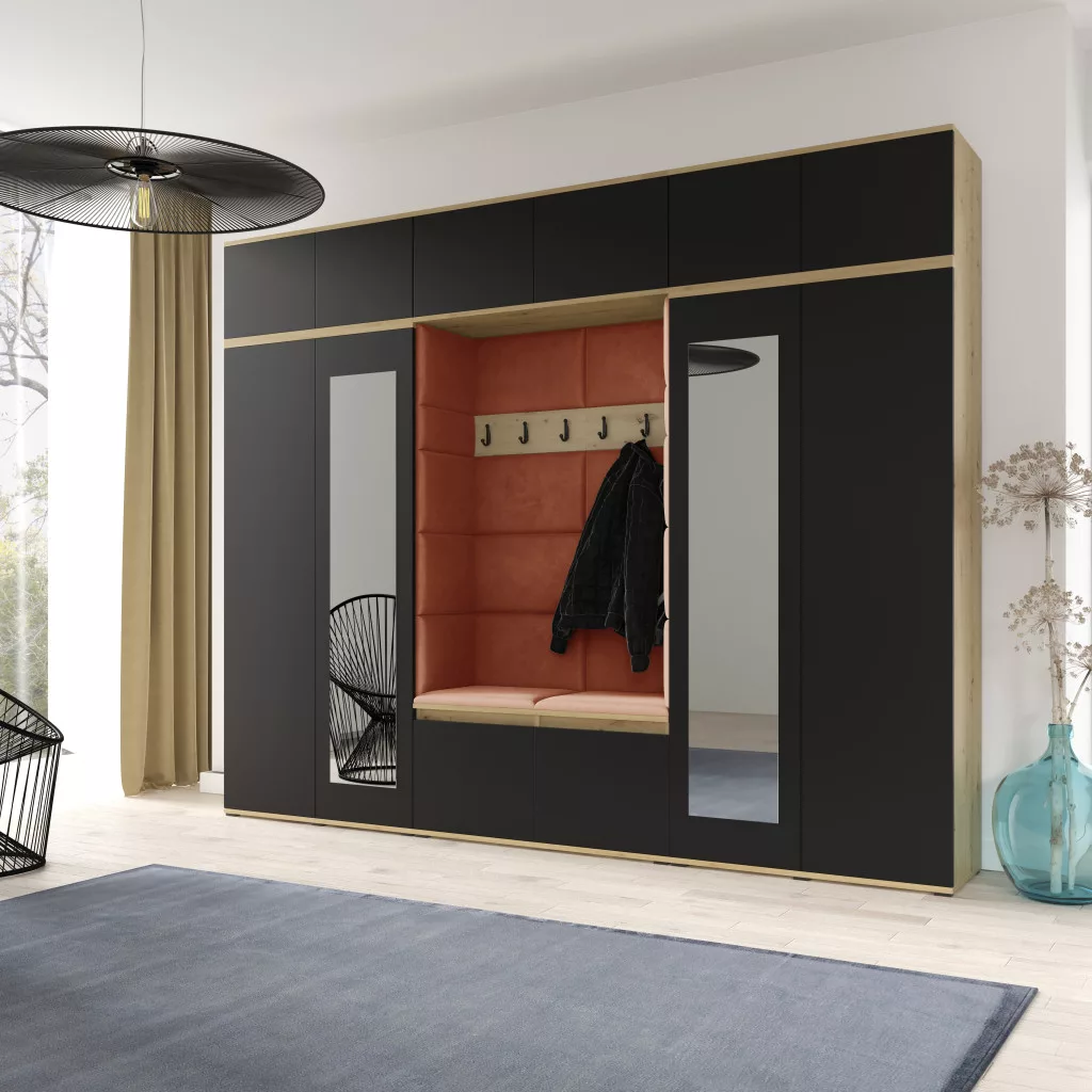Blum 17 kárpitozott előszobafal tükörrel, artisan/fekete - narancssárga 25 - egyedi