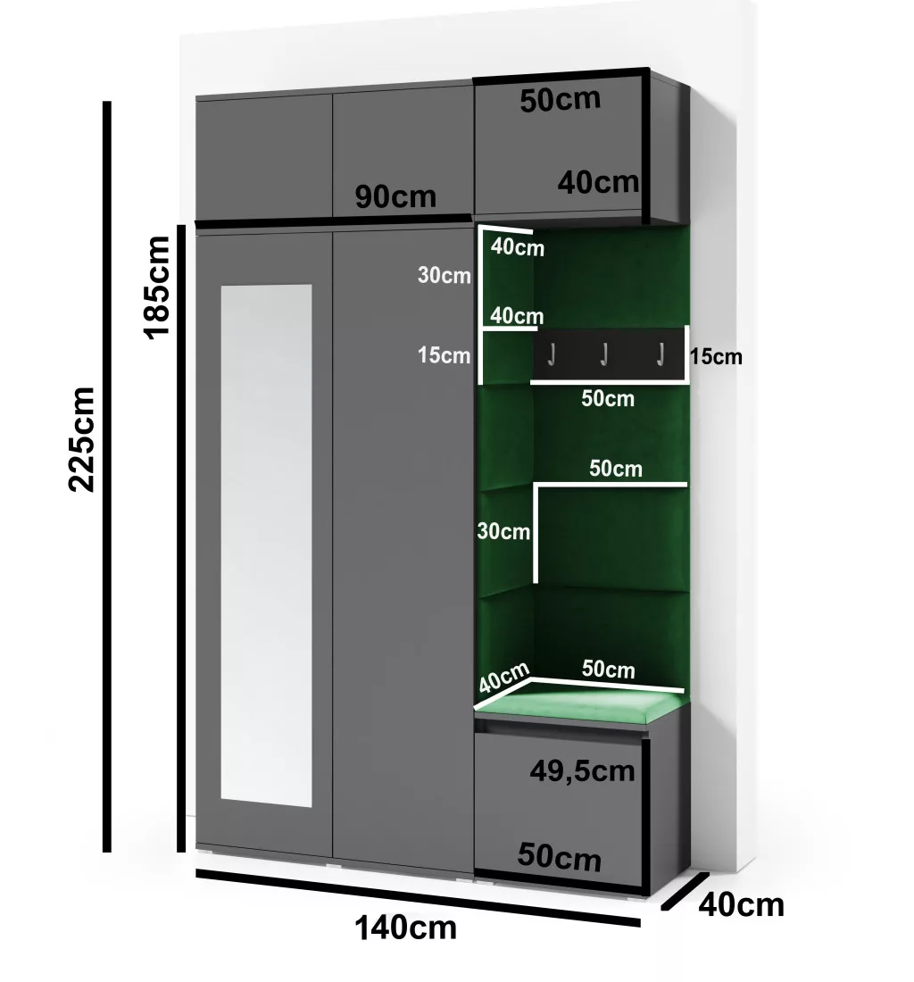 1 db gardróbszekrény - 2 db polccal, 2 db akasztóval - ajtói push-to-open rendszerrel, benyomásra nyílnak