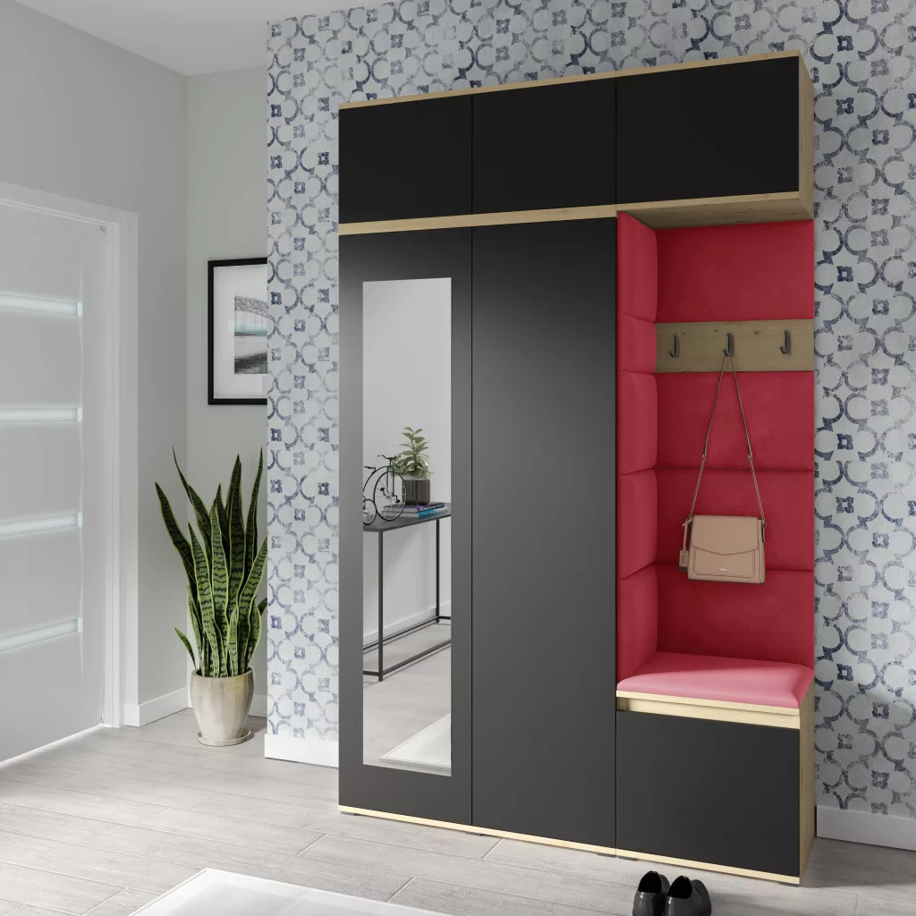 Blum 18 kárpitozott előszobafal tükörrel, artisan/fekete - piros 09 - egyedi