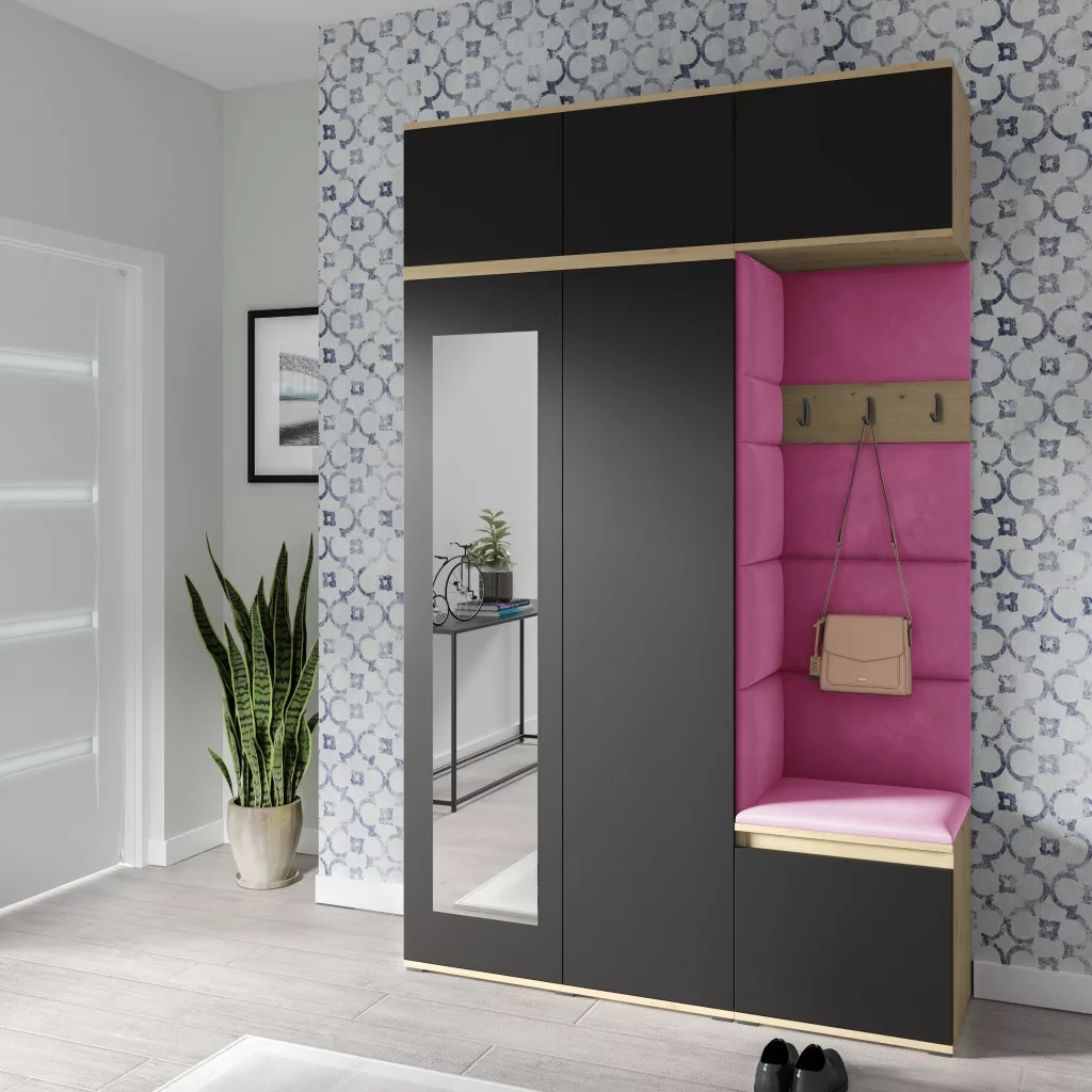 Blum 18 kárpitozott előszobafal tükörrel, artisan/fekete - pink 10 - egyedi