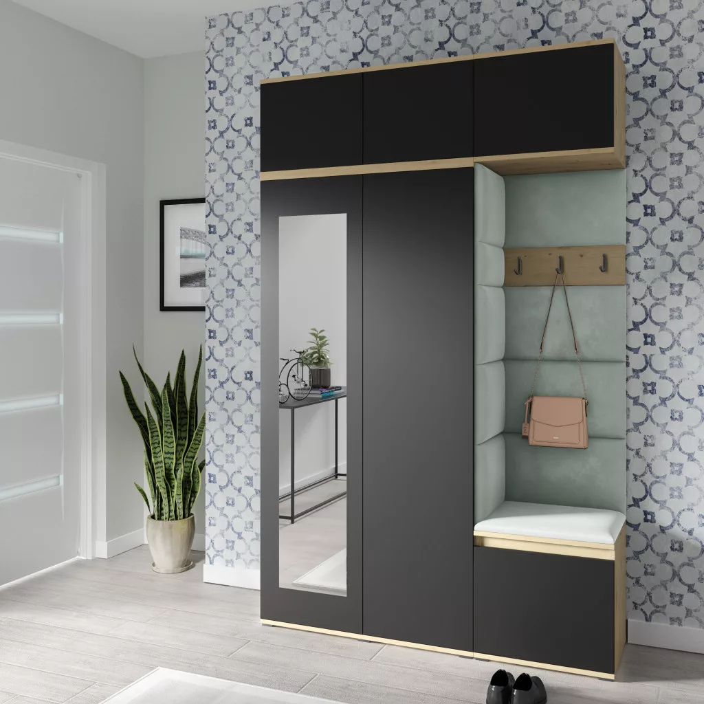 Blum 18 kárpitozott előszobafal tükörrel, artisan/fekete - menta 21 - egyedi