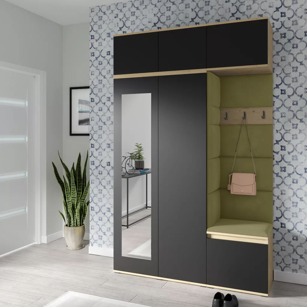 Blum 18 kárpitozott előszobafal tükörrel, artisan/fekete - oliva zöld 27 - egyedi