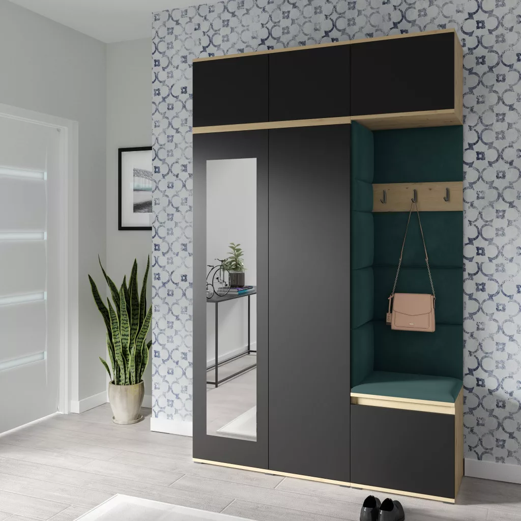 Blum 18 kárpitozott előszobafal tükörrel, artisan/fekete - sötétzöld 28 - egyedi