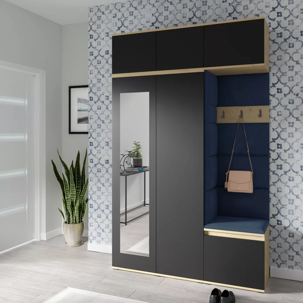 Blum 18 kárpitozott előszobafal tükörrel, artisan/fekete - sötétkék 30 - egyedi
