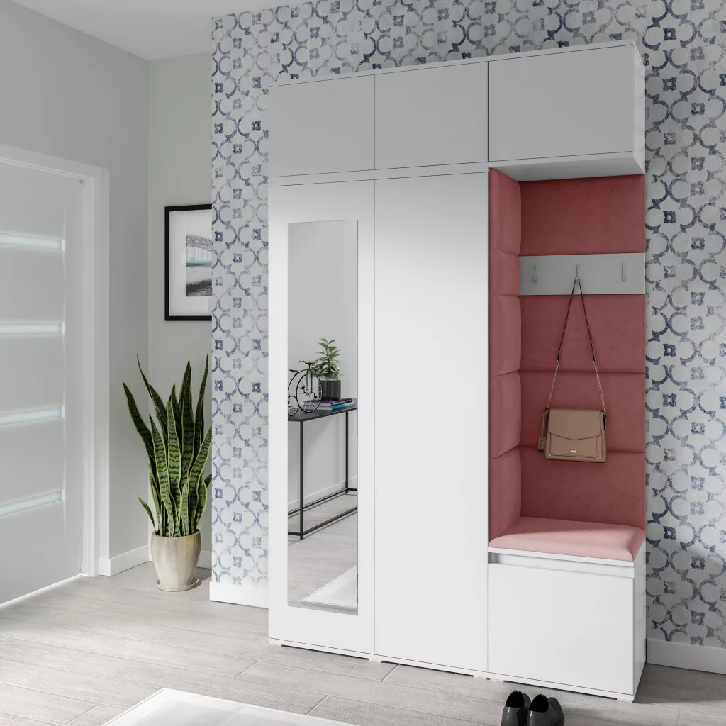 Blum 18 kárpitozott előszobafal tükörrel, fehér - rózsaszín 23 - egyedi