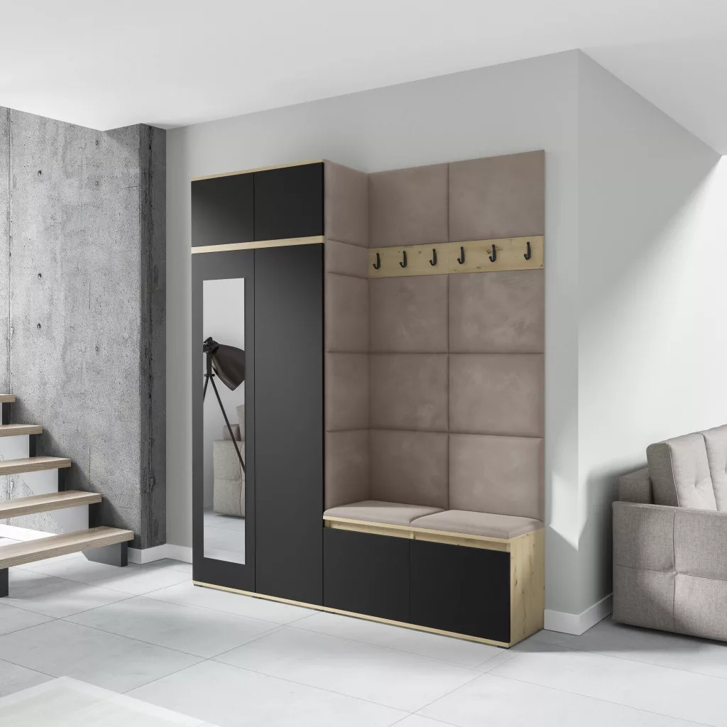 Blum 19 kárpitozott előszobafal tükörrel, artisan/fekete - bézs 03