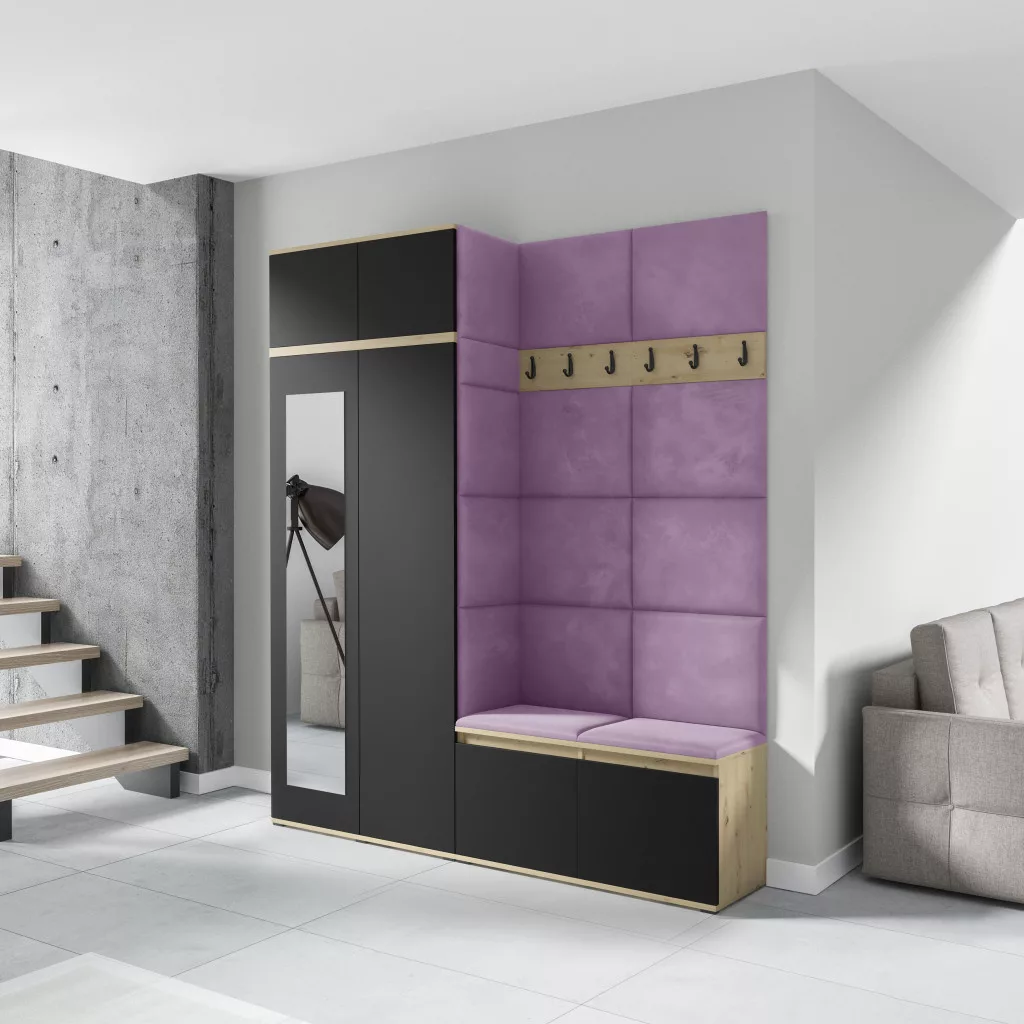 Blum 19 kárpitozott előszobafal tükörrel, artisan/fekete - lila 11 - egyedi