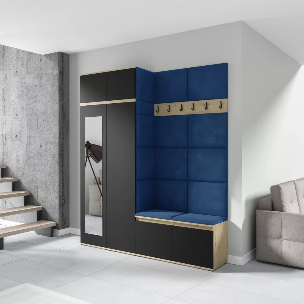 Blum 19 kárpitozott előszobafal tükörrel, artisan/fekete - sötétkék 31 - egyedi