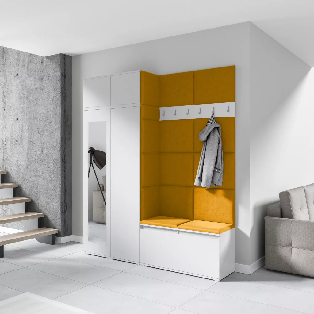Blum 19 kárpitozott előszobafal tükörrel, fehér - sárga 26 - egyedi