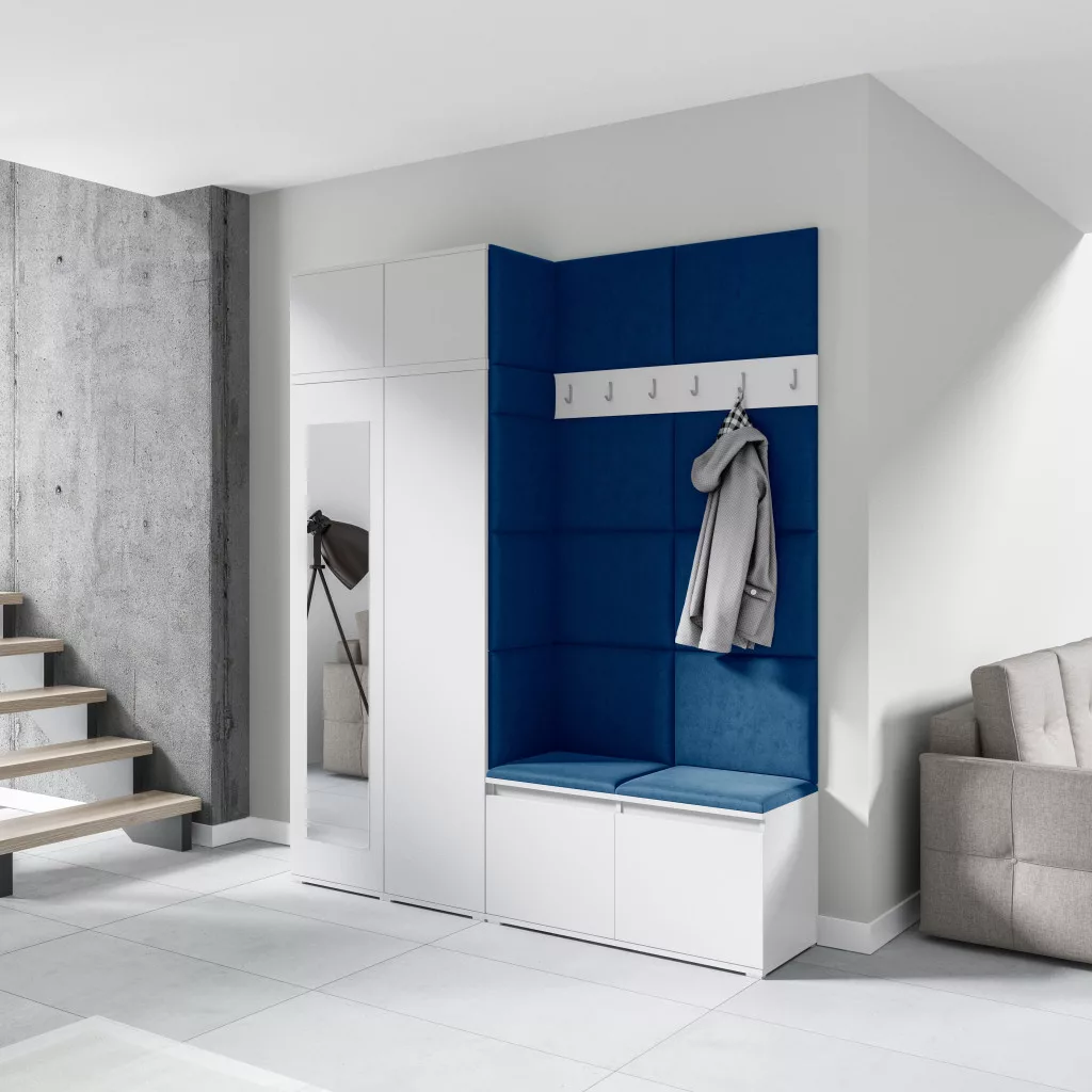 Blum 19 kárpitozott előszobafal tükörrel, fehér - sötétkék 31 - egyedi