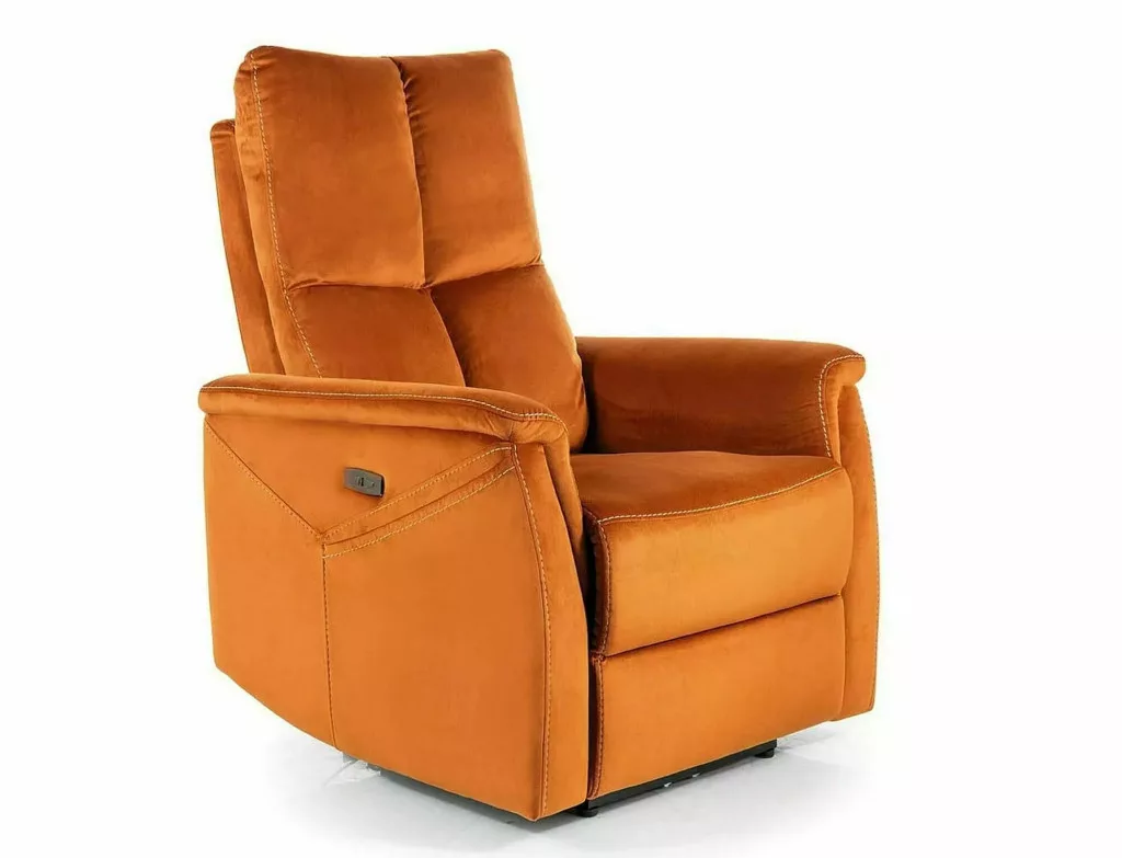 Elektromos dönthető fotel masszázsfunkcióval, bársony szövet: Bluvel, szín: fahéj 4215. A dönthetőség a fotel jobb oldalán található panellel vezérelhető. A panel megvilágított USB-porttal is fel van szerelve. A masszázsfunkciók vezetékes távirányítóval állíthatók, beleértve: a működési időt, a masszázszónát és az intenzitás kiválasztását, valamint az ágyéki fűtést. A fotel oldalán egy praktikus zseb található.
