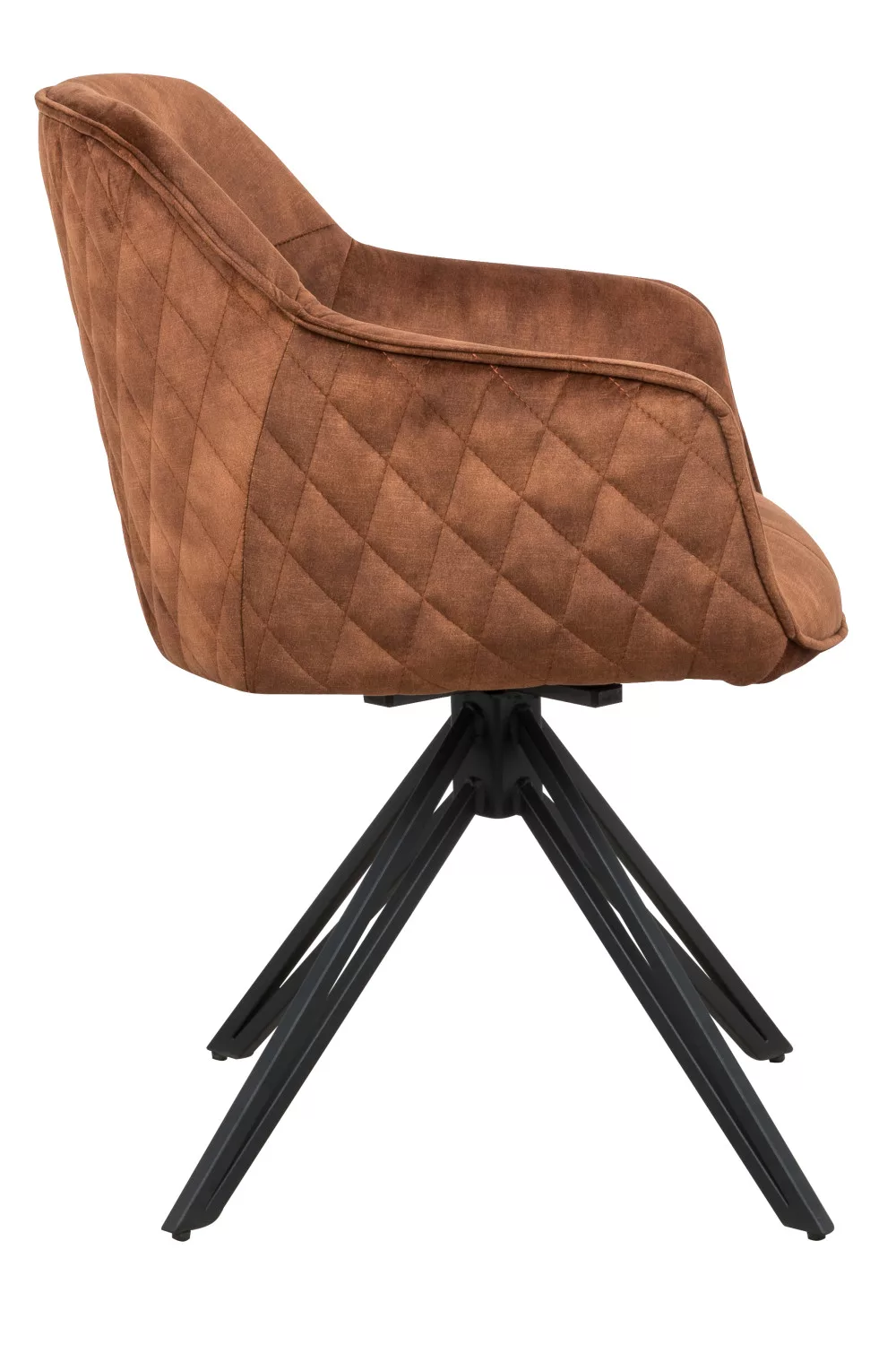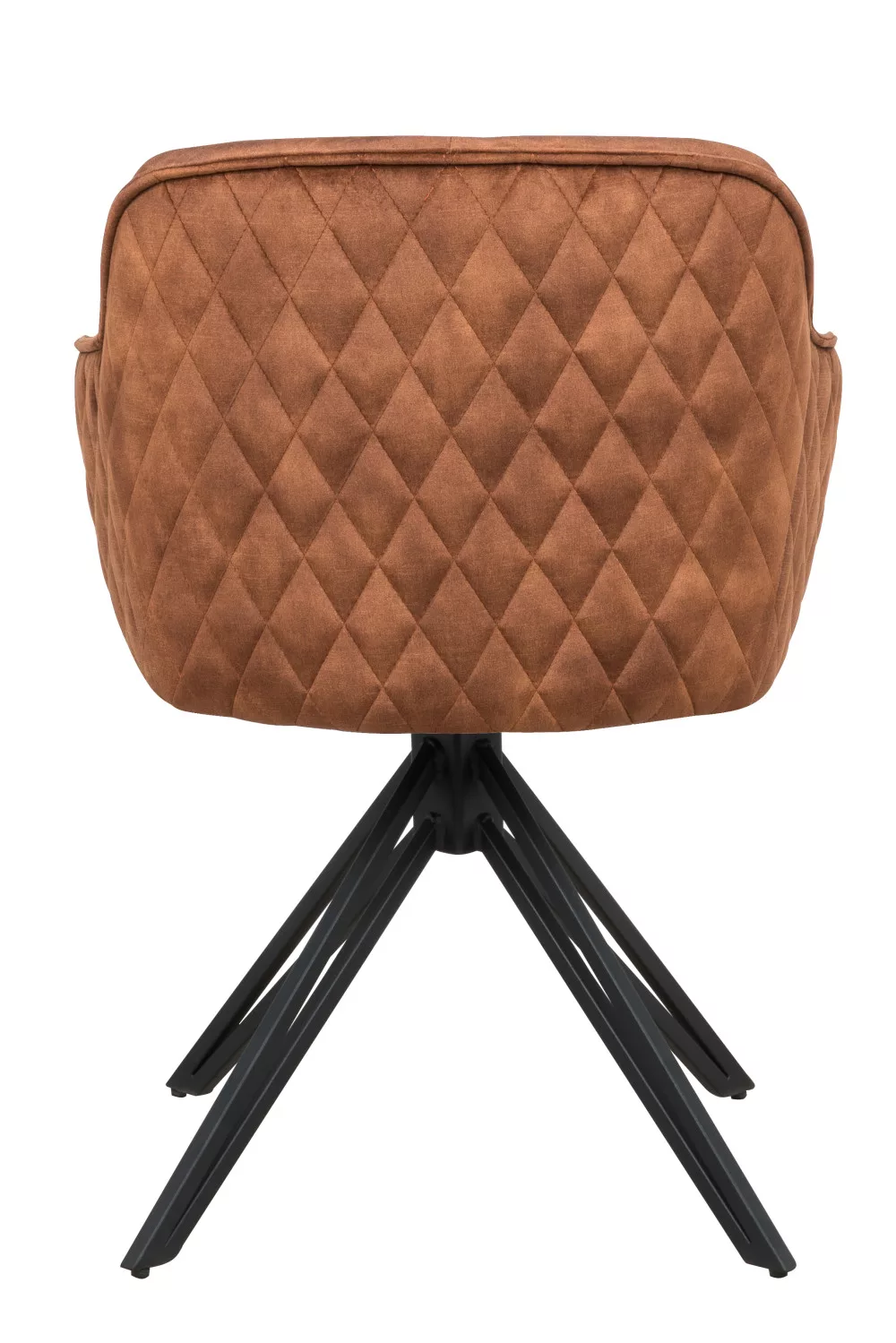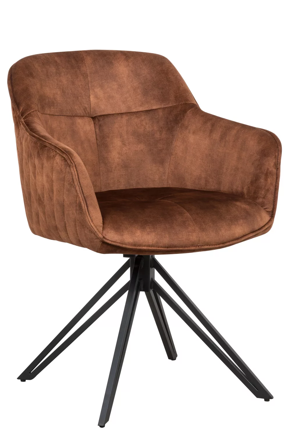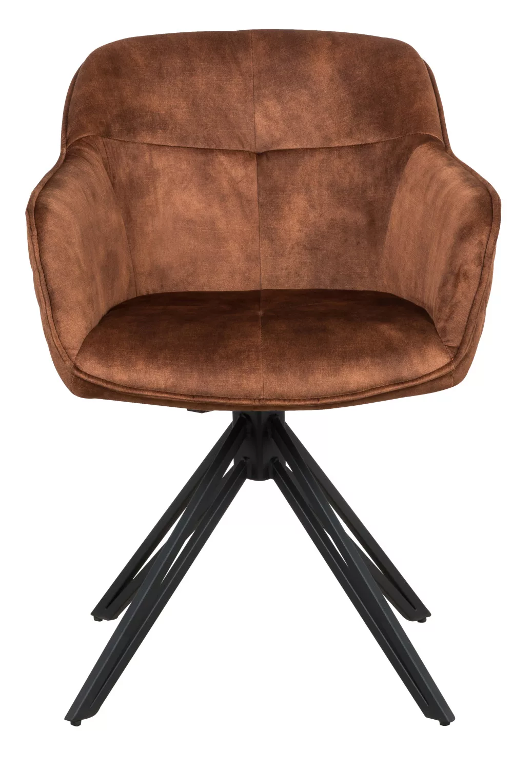 A szék ülőfelülete és háttámlája barna színű szövetből készültek. Lába 180°-ban elforgatható porszórt fém.